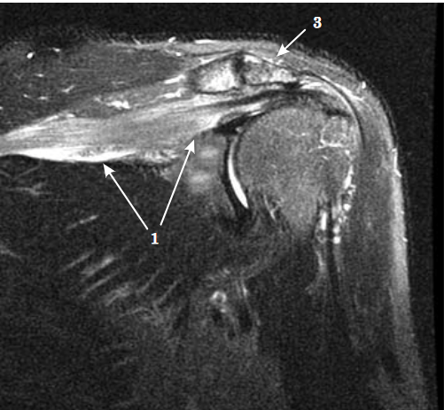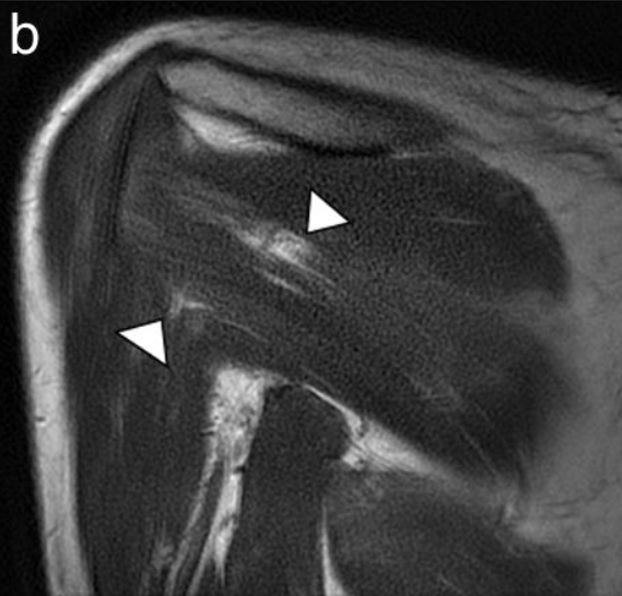 - Resonancia magnética: Cuando se sospeche de otra causa potencial (neoplasia, hernia cervical…) y nos puede mostrar si se realiza el estudio sobre la musculatura afectada. Mostrando patrones de edema difuso en fases iniciales y el aumento de infiltración grasa intramuscular en fase tardía.